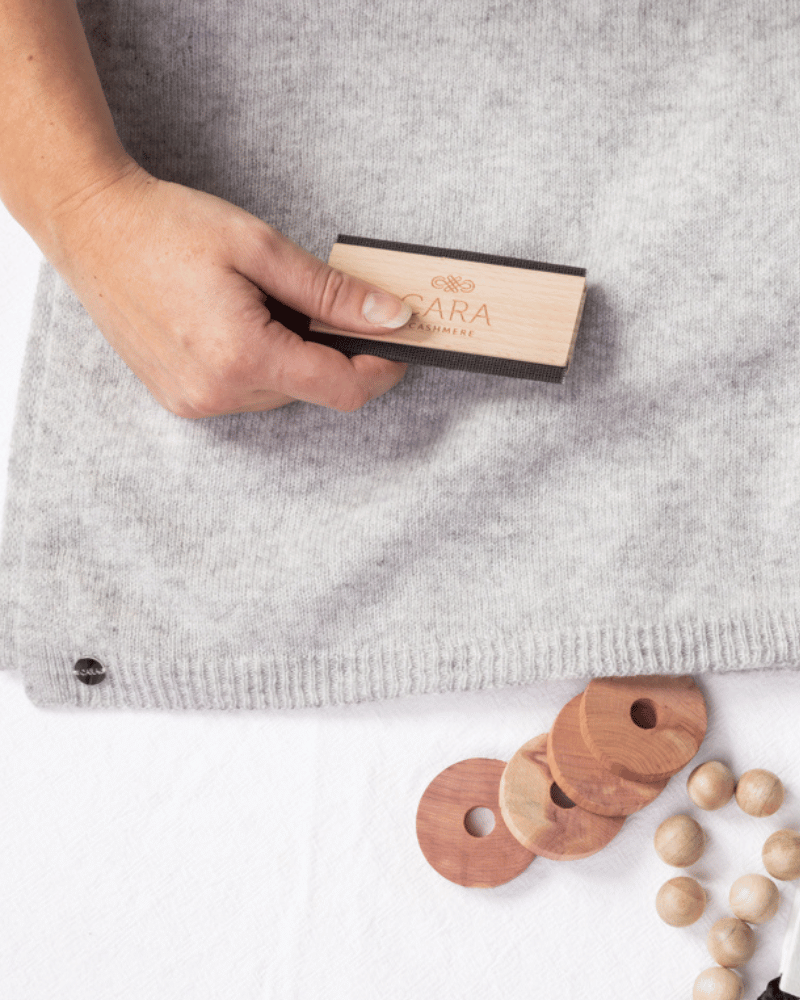 - All cashmere is prone to pilling. To prevent this, avoid friction with hard objects or coarse clothing. In case of pilling, use a cashmere comb to lightly brush over the item or remove by hand.