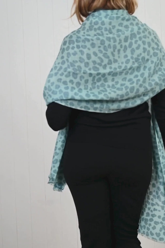 The stunning Leopard Cashmere Scarf in Ice features a beautiful blend of blues and aquas, making it a fashionable must-have, even for those who typically shy away from leopard print.